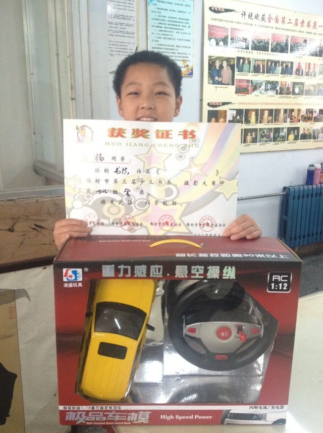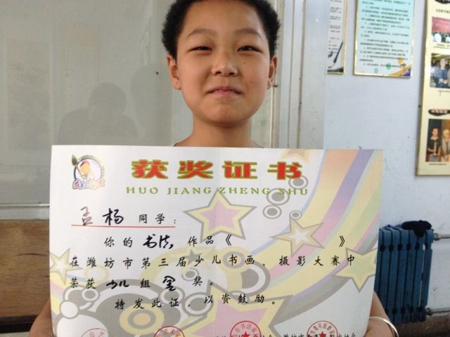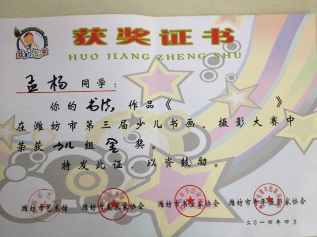 喜讯:许斌书院书法美术学校学生孟扬在由潍坊巿艺术馆、潍坊书法家协会、潍坊巿美术家协会、摄影家协会联合举办的潍坊巿第三届书画摄影展中获少儿组金奖(金奖一名)为学校获得了荣誉!特奖大汽车一辆!希望再接再励再创佳绩!