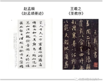 赵孟頫:是学习了王義之并结合了唐代书法, 字体偏圆润。唐人尚法,由于结合了唐人会比较工整 , 圆多方少 。拐折处也几乎都是圆的或外圆内方。只有少部分带方。赵孟頫的字体更规整偏中性, 字体大小基本一样笔画也都偏圆润。