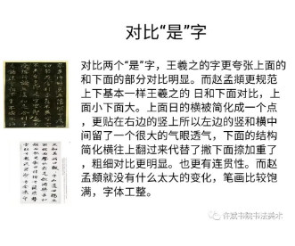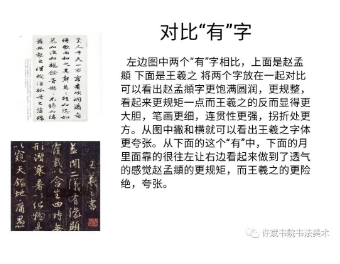 王羲之: 方圆结合, 笔画比较瘦硬,变化多端,相对于赵孟頫更险绝。粗细变化明显, 变化多端。很多地方压一下是为了调锋。一笔之内粗细变化明显。王義之的字几乎都是不是正的,欹侧取势。有的地方非常松 , 有的地方就靠的非常紧, 形成了鲜明的对比。左右对称的字会留气眼, 疏密得当。