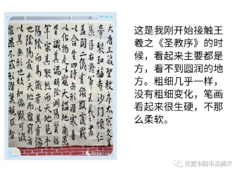 在2021年3月份跟着许老师进入弟子班之后我接触了王羲之,主要学习了王羲之行书的代表作《圣教序》,在学习王羲之行书之前先学了多年的楷书,如颜真卿楷书,欧阳询楷书。在去年总结的时候,许老师根据我的书作, 在肯定我书法作品进步的同时,给我提出了新的建议和方向。王羲之的字是方圆结合,但我总把字写得很方,体现不出圆润。所以许老师教我同时学习赵孟頫行书作品。赵孟頫晚年的字迹是由王羲之结合唐代的唐楷行书结合而成。所以我要学习赵孟頫的用笔方法,饱满圆润有厚度。才能去更好的理解和学习王羲之《圣教序》。。
