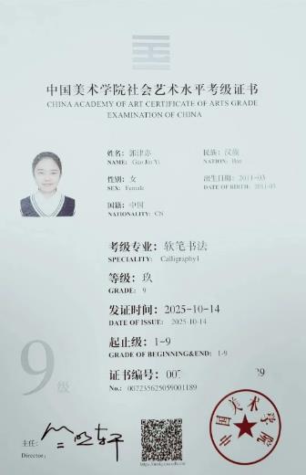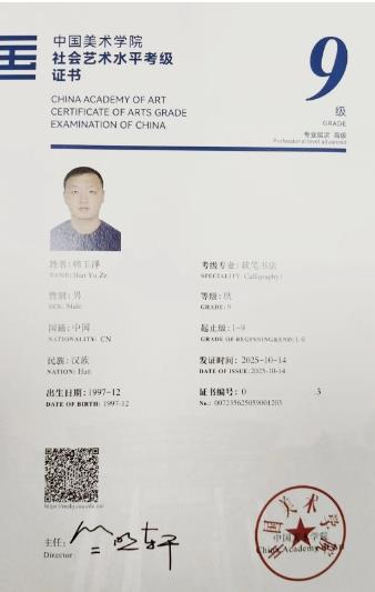 2025许斌书院在中国美术学院书法考级中再创佳绩,其中九级(最高级)两人。郭津亦毛笔书法九级,韩玉泽毛笔书法(专业级)九级。希望同学们继续努力!不断超越自我,获得更高的荣誉。